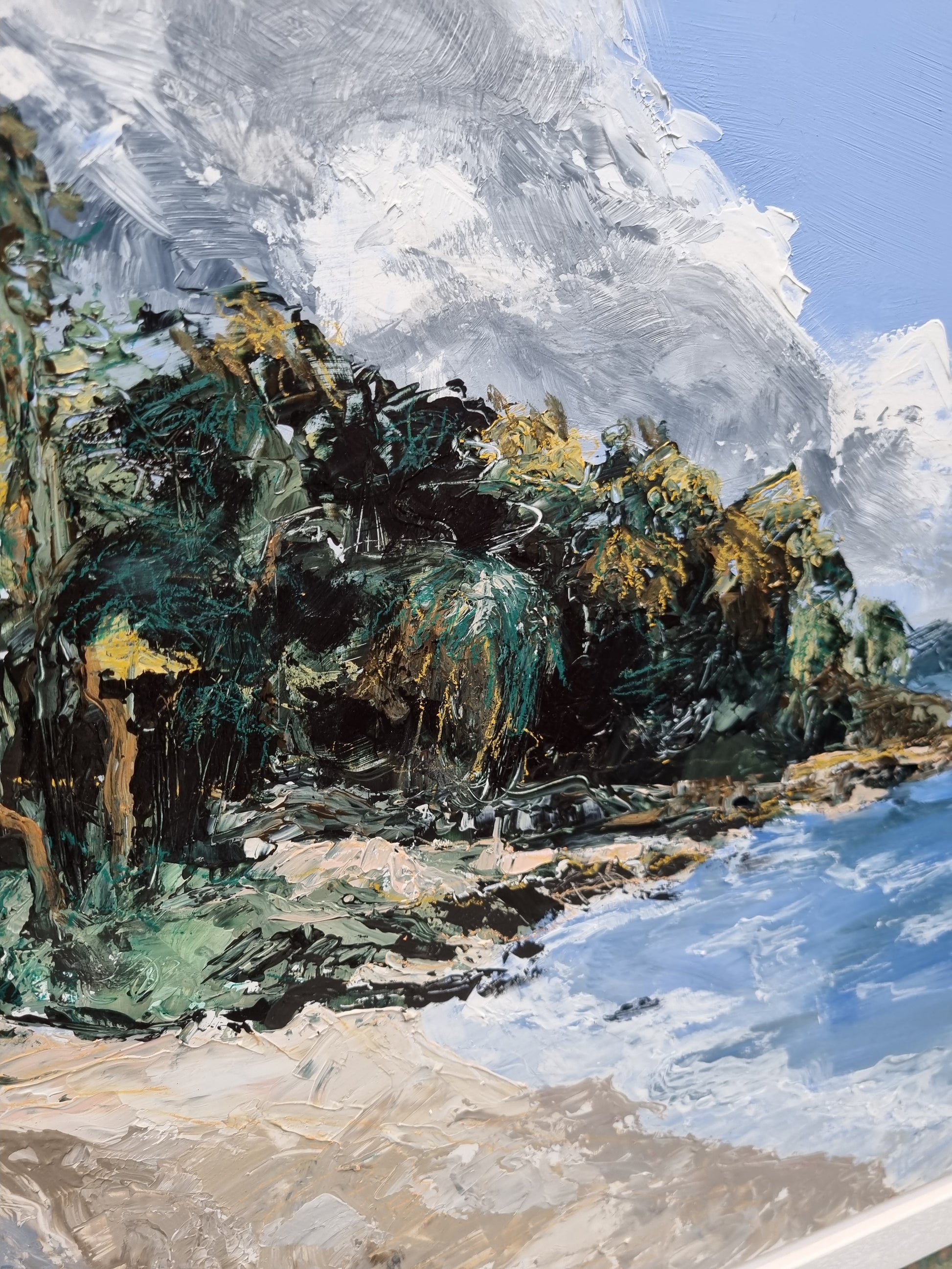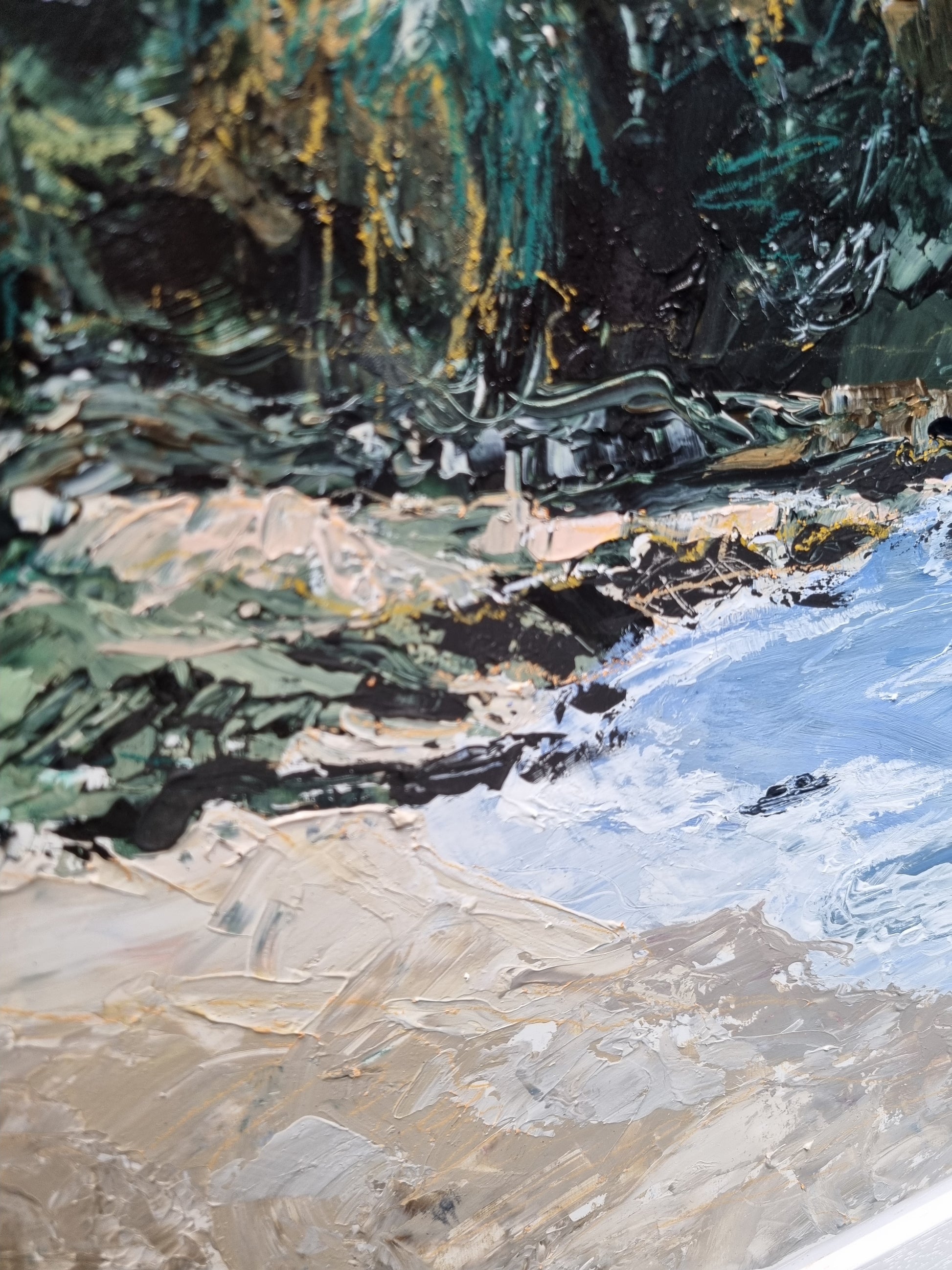Painted on a 40cm square wooden panel, and professionally framed, this palette knife painting is done from my original sketches at the Helen's Bay end of Crawfordsburn beach.