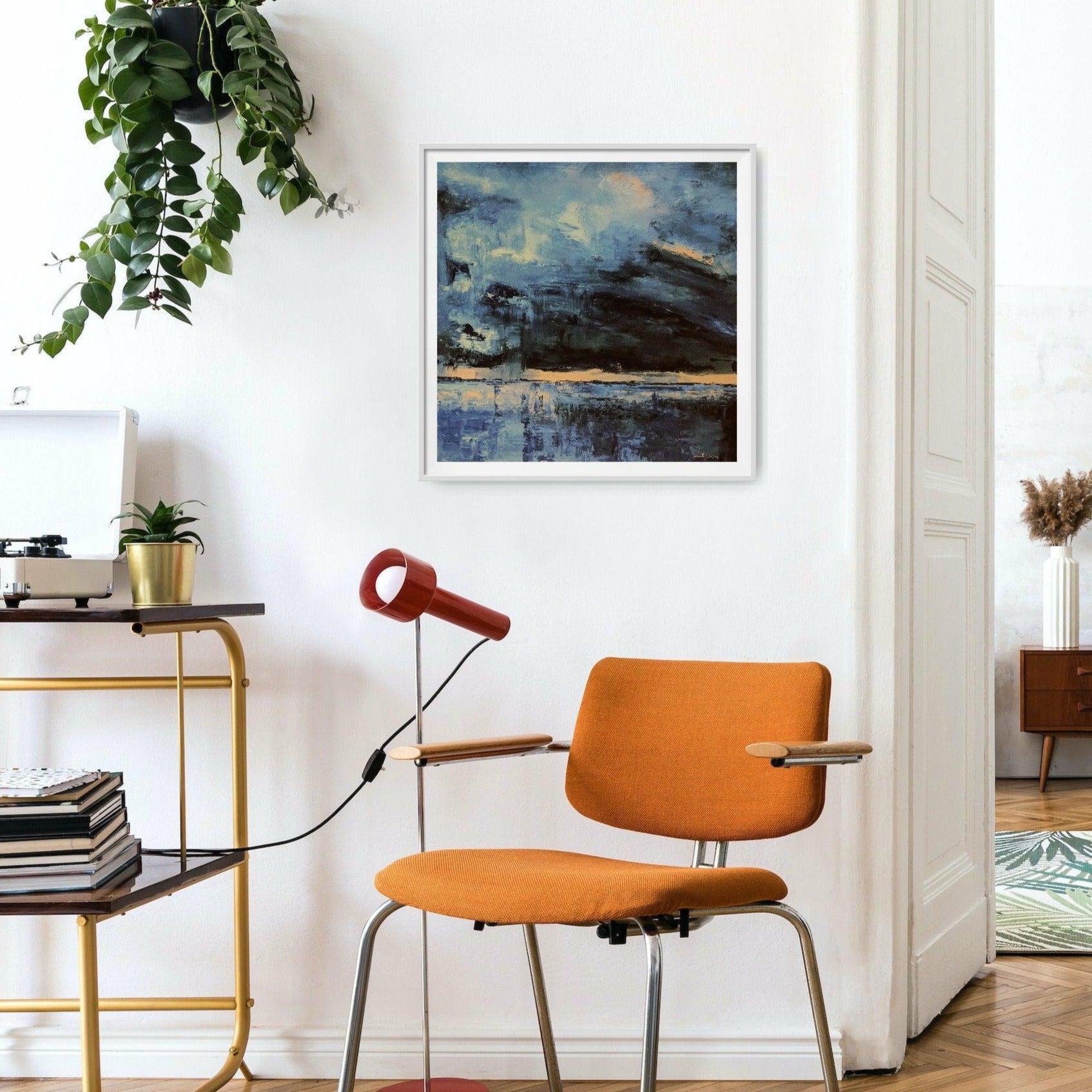 Atmospheric sea scape print in stormy hues of blue and peachy orange.