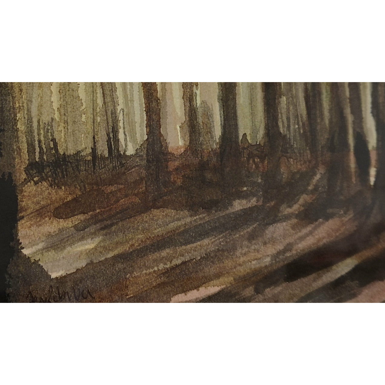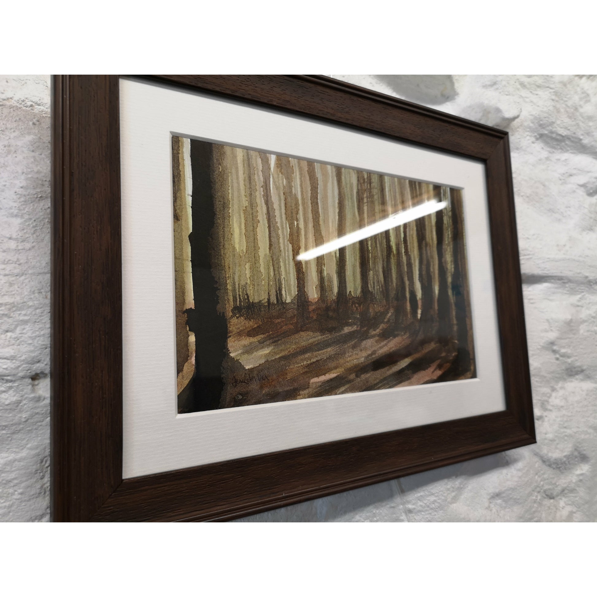 A forest light study in shellac ink and Indian ink on paper, framed in brown. Approx 10 X 12.5"