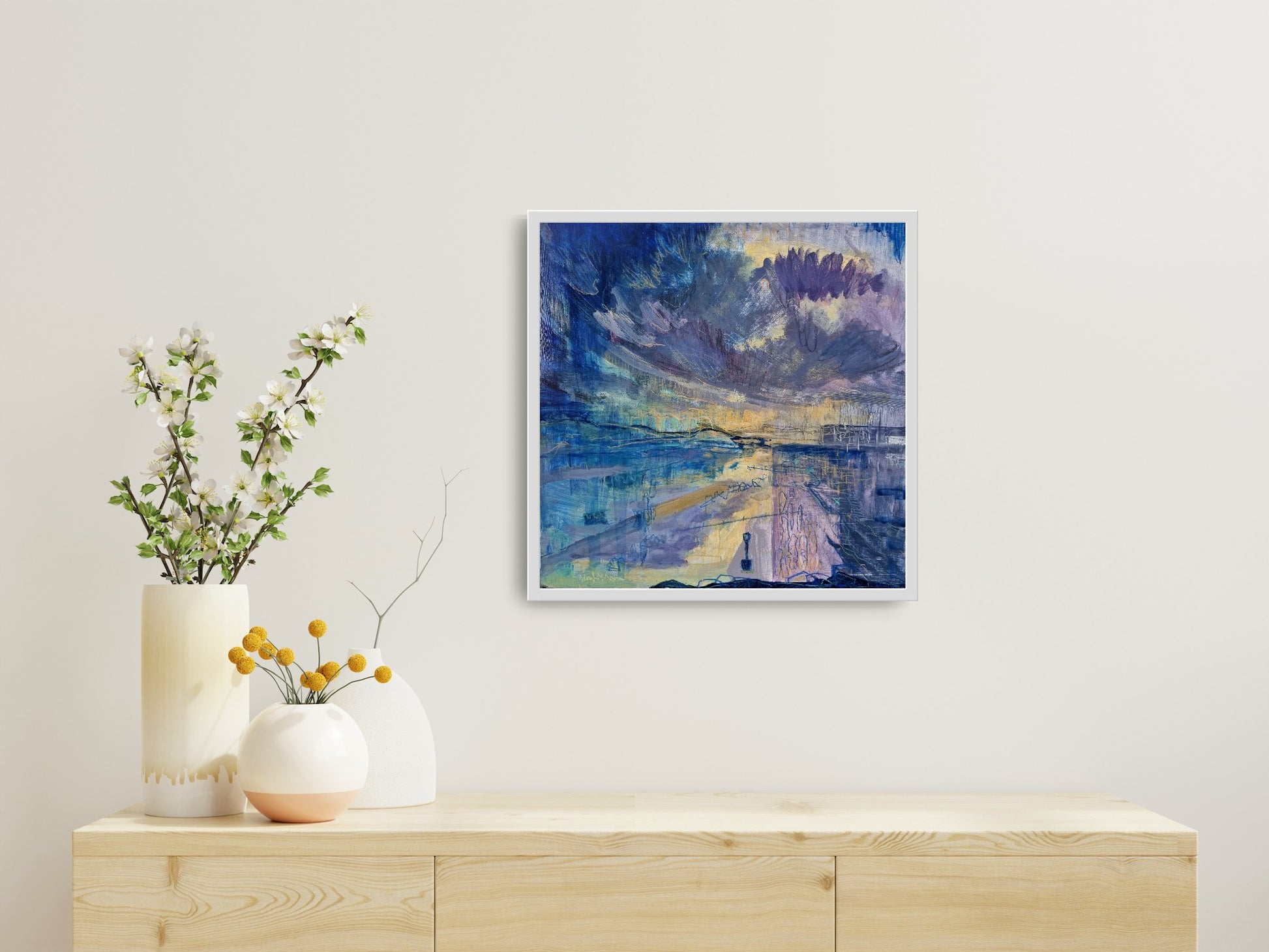 At 30 x 30cm plus frame, this painting is one of the journey pieces exploring a colour palette inspired by winter sunsets on our local beach. Hues of purple, blue and yellow capture the late afternoon light, cold in December but beautiful and rich.